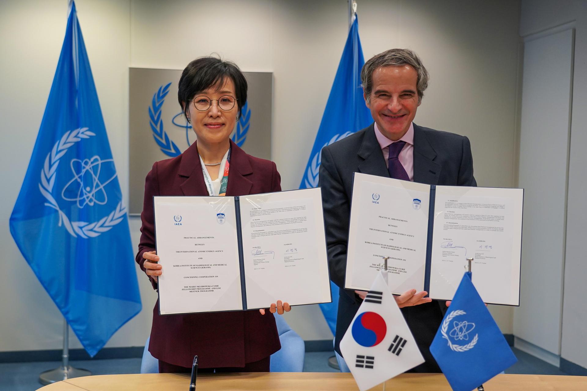 Korea Institute of Radiological and Medical Sciences (KIRAMS) President Lee Jin-kyung, left, poses with International Atomic Energy Agency Director General Rafael Grossi throughout a signing ceremony for his or her partnership on the Vienna International Centre, Austria, in November 2024. Courtesy of KIRAMS