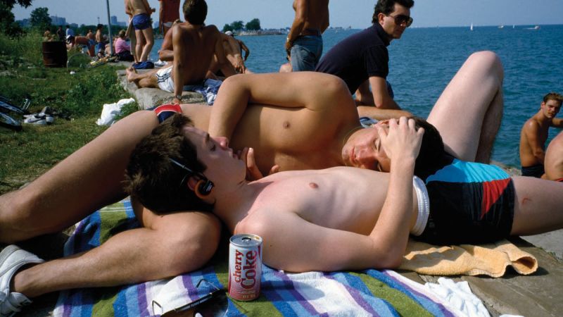 In a grassy outcrop alongside Lake Michigan’s deep blue waters, two younger men pictured in a colour slide {photograph} loosen up on towels, shirtless and curled towards one another. Along the rocky ledges, different men chat and sunbathe, bicycles and footwear deserted on the floor. A classic Cherry Coke can — one in every of the picture’s solely markers of time — provides the intimate scene a delicate feeling of an idyllic commercial, and a sense of nostalgia.