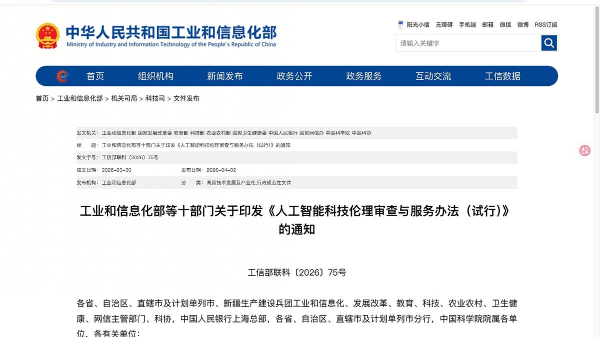 On April 3, 2026, China’s Ministry of Industry and Information Technology, along with 9 different authorities companies, collectively issued the Administrative Measures for the Ethical Review and Services of Artificial Intelligence Science and Technology (Trial).