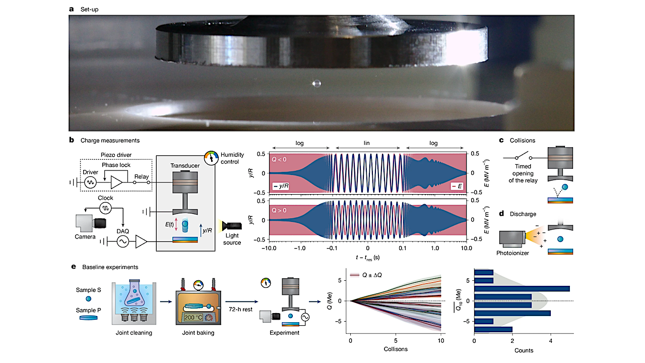 a, We levitate a 500-μm silica sphere in an acoustic entice above a silica goal plate. b, Charge is measured by making use of a frequency-swept electrical subject, E(t), and extracting the trajectory of the sphere, y(t), utilizing a high-speed digicam. The amplitude and part of y(t) at resonance rely, respectively, on the magnitude and signal of the particle’s cost, Q. c, Timed interruptions of the acoustic subject set off charge-exchanging collisions between the sphere and the plate, during which the sphere falls, bounces off the plate and is then ‘caught’ once more. d, The whole system could be discharged utilizing an X-ray photoionizer. e, Every sphere expenses with a scientific signal and magnitude in opposition to its accomplice plate, however the slopes for an ensemble of sphere/plate pairs are unfold randomly about zero. — Institute of Science and Technology Austria