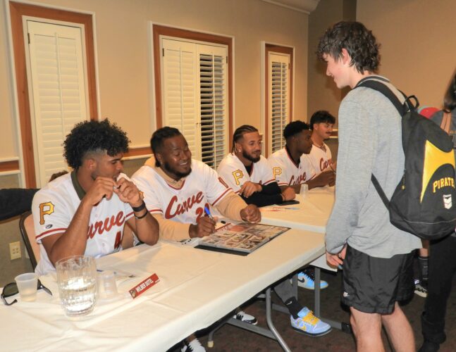 Altoona Curve fan Christian Wendt talks with pitcher Cristofer Melendez as he gathers autographs at FanFest 2025 from Curve gamers from left to proper: Wilber Dotel, Melendez, Kervin Pichardo, Jaden Woods and Anthony Solometo. This 12 months’s occasion will happen from 5:30 to eight:30 p.m. Tuesday, March 31, on the Altoona Grand Hotel.