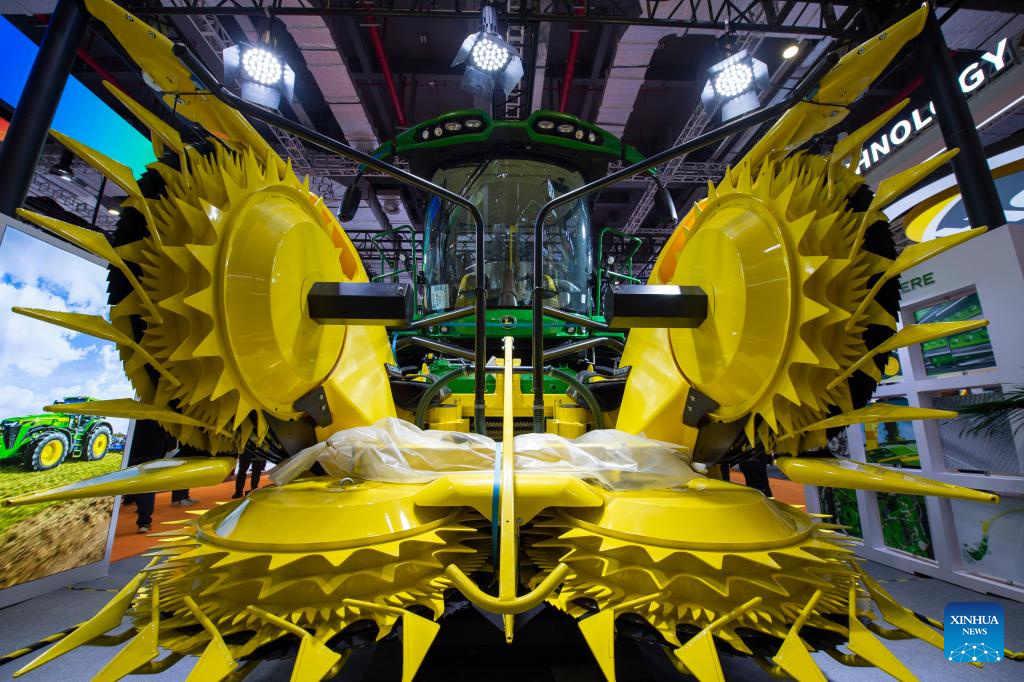 A self-propelled harvester is pictured at the Intelligent Industry and Information Technology exhibition space of the eighth China International Import Expo (CIIE) in east China’s Shanghai, Nov. 6, 2025. The 8th CIIE, which opened in Shanghai on Wednesday and can final until Nov. 10, showcases superior equipments, cutting-edge technologies and innovation merchandise in fields similar to science and expertise, manufacture and medical business. (Xinhua/Ding He)