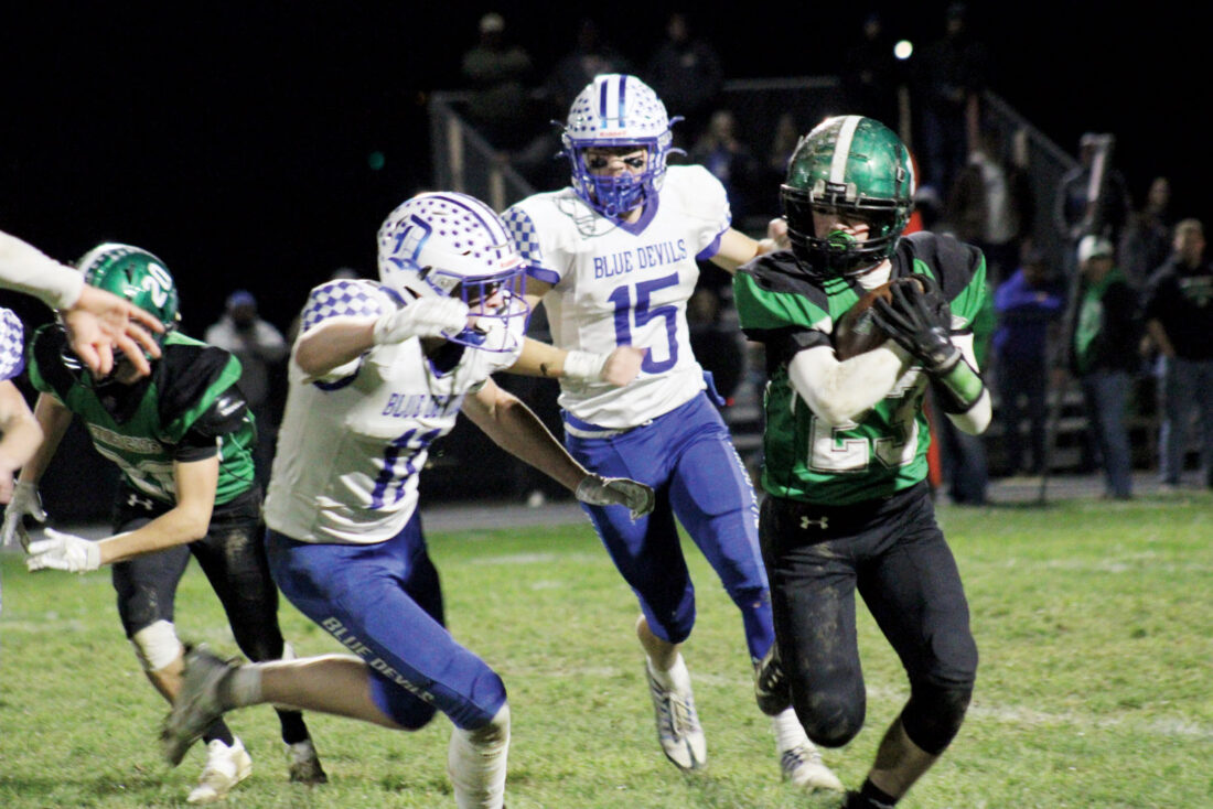 Waterford’s Hayden Jones will get wrapped up by a Danville defender throughout Friday’s Ohio Division VII regional semifinal. (Photo by Kerry Patrick)