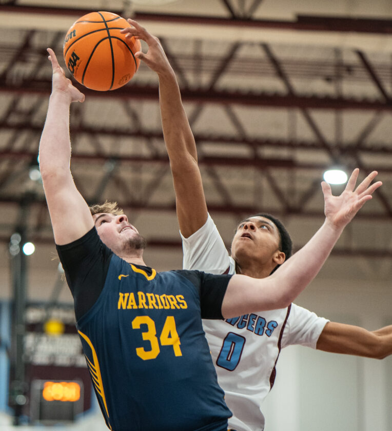Brennen Imbro of Montoursville and Saoj Jones of Loyalsock combat for a free ball at Loyalsock High School. Montoursville gained 57-50.