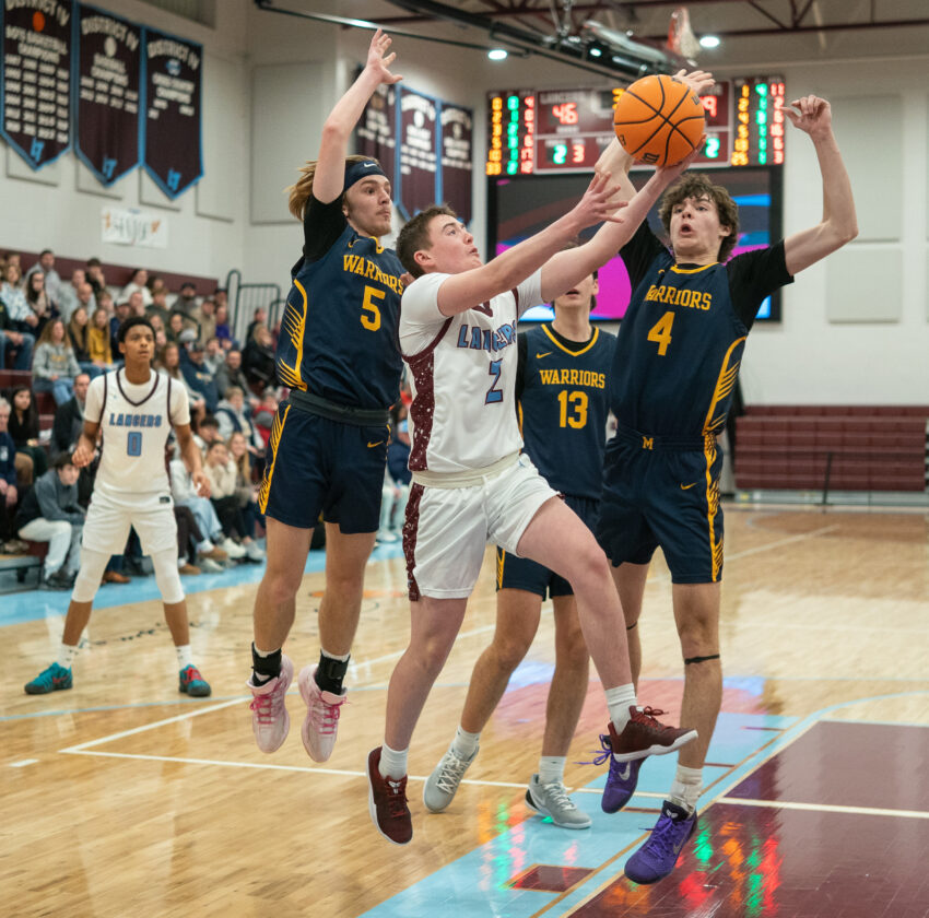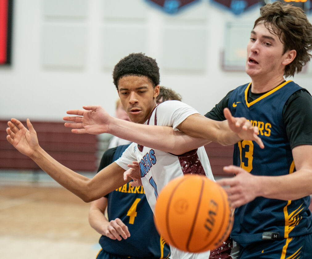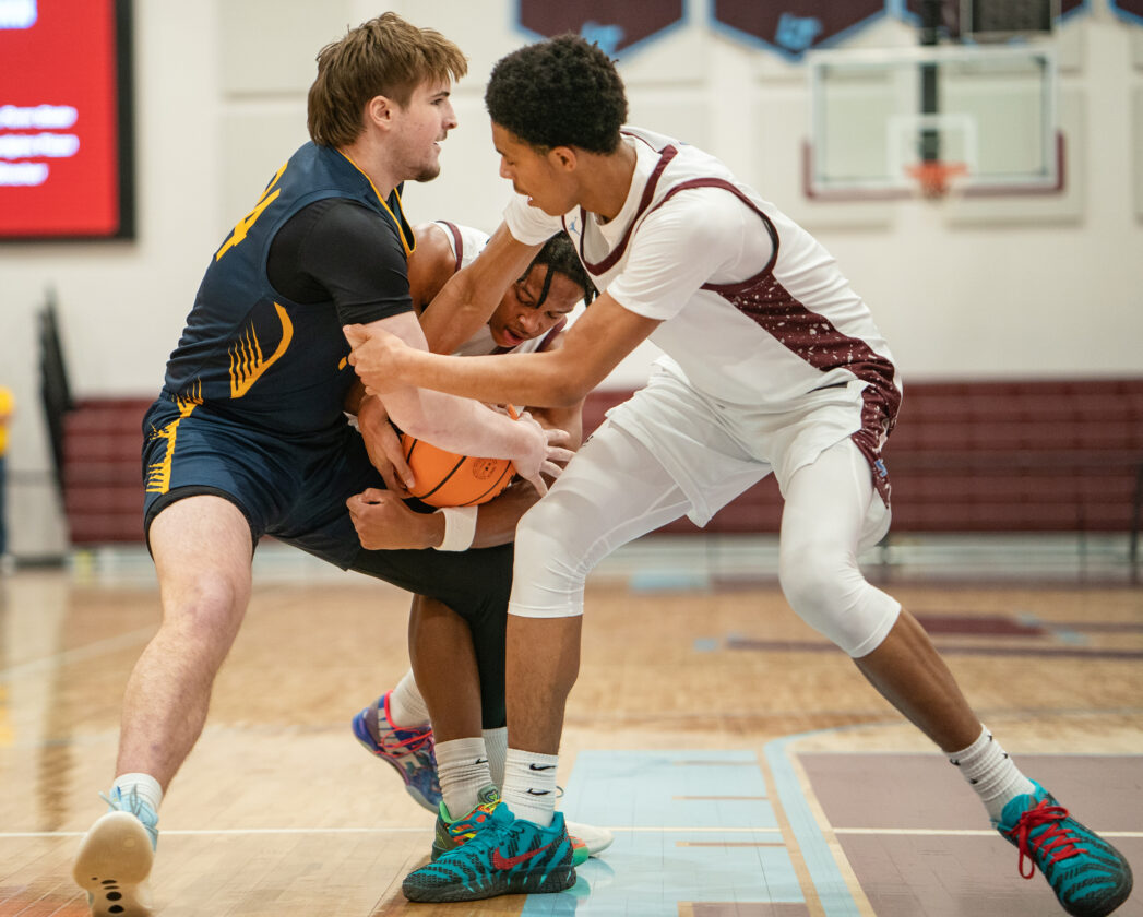 Kingston Fisher of Montoursville and Jalil Coates (heart) and Saoj Jones of Loyalsock combat for possession of the ball at Loyalsock High School. Montoursville gained 57-50.