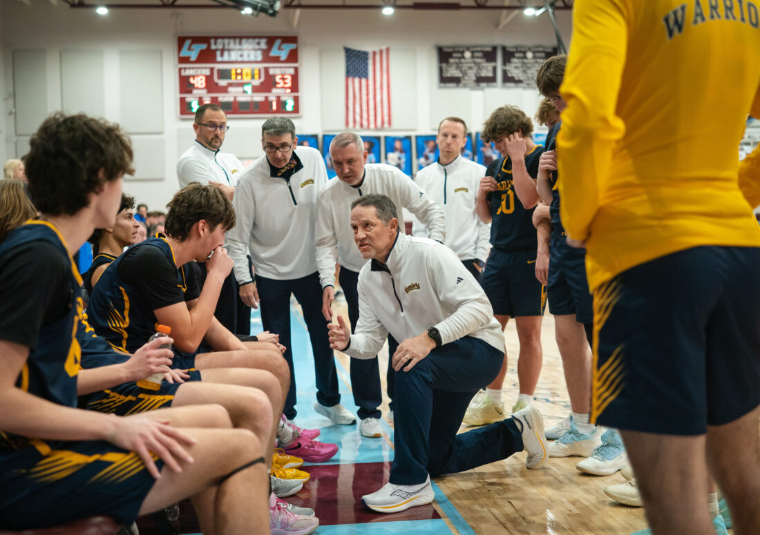 Montoursville head coach Mike Mussina talks together with his staff throughout a trip with 1:01 to go within the recreation in opposition to Loyalsock at Loyalsock High School. Montoursville gained 57-50.