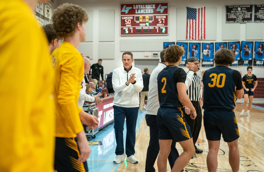 Montoursville head coach Mike Mussina claps for his staff as they have fun a win over Loyalsock at Loyalsock High School. Montoursville gained 57-50.