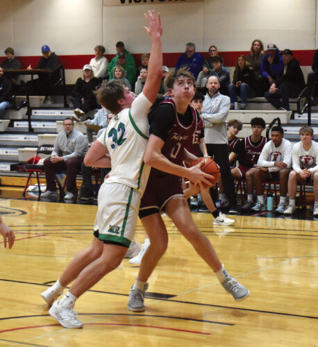 ABOVE: Fairmont’s Logan Junkermeier battles to get a shot off in opposition to Maple River’s Carson Healy (32) throughout a Kwik Trip Holiday Boys Basketball Tournament sport on Friday at Bethany Lutheran College.
