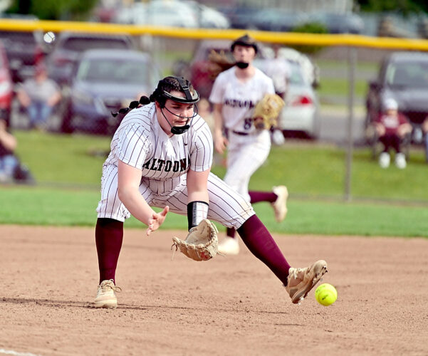 Jayda Yost tracks a grounder at third base for Altoona in the Lady Lions’ softball victory over Juniata High School on Wednesday afternoon at the Logan Elementary Field. See roundup here.