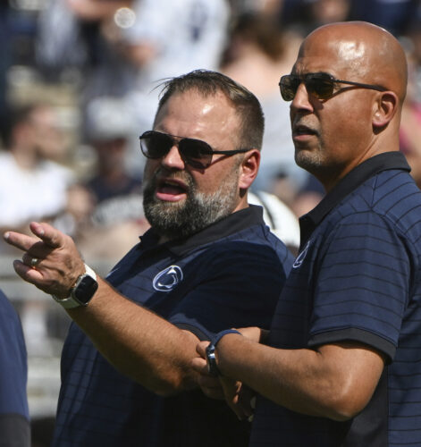 Penn State offensive coordinator Andy Kotelnicki talks with head coach James Franklin throughout heat ups for an NCAA faculty soccer recreation towards Villanova, Saturday, Sept. 13, 2025, in State College, Pa. (AP Photo/Barry Reeger)