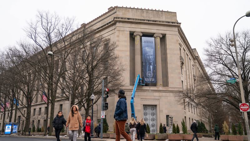 A big banner of Donald Trump was hung exterior of the Justice Department headquarters in Washington, DC, on Thursday, emphasizing the White House’s management over the nation’s high legislation enforcement department that when pursued felony prosecutions in opposition to the president.