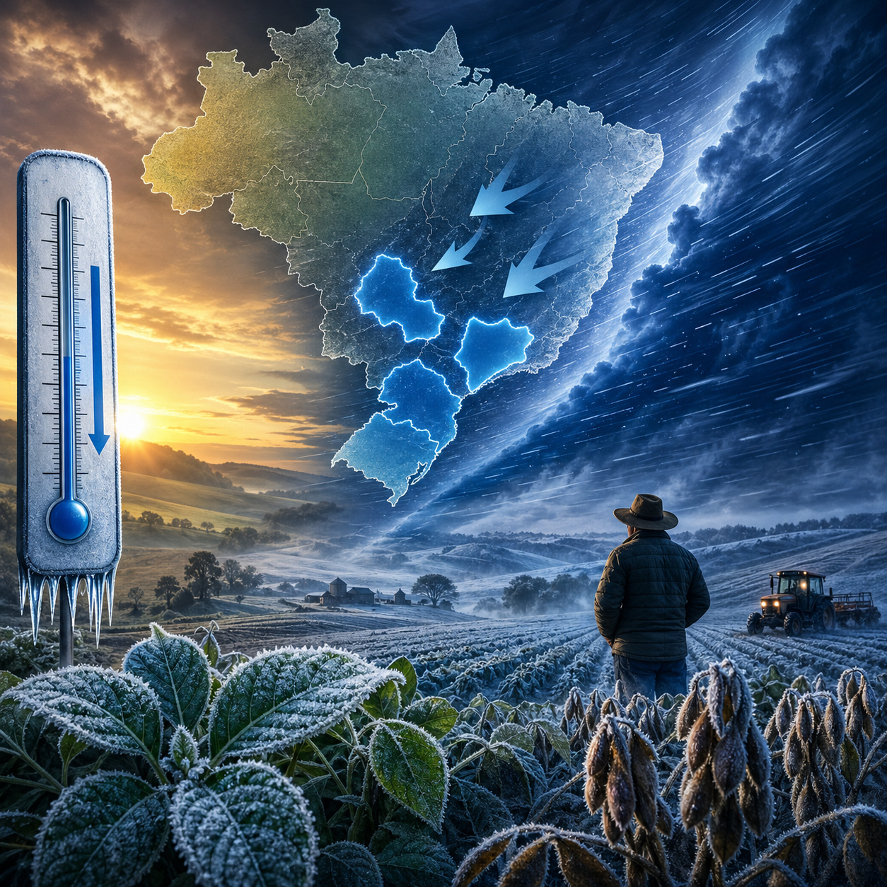 South of Mato Grosso do Sul, southern São Paulo, Sul de Minas, and the Mantiqueira Mountains enter the most critical cold zone, with above-normal heat before the polar air mass, a sharp drop in temperatures during the early mornings, and an increasing risk for crops, vegetables, coffee, and low-lying areas.
