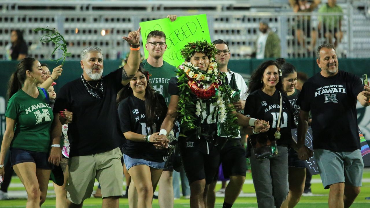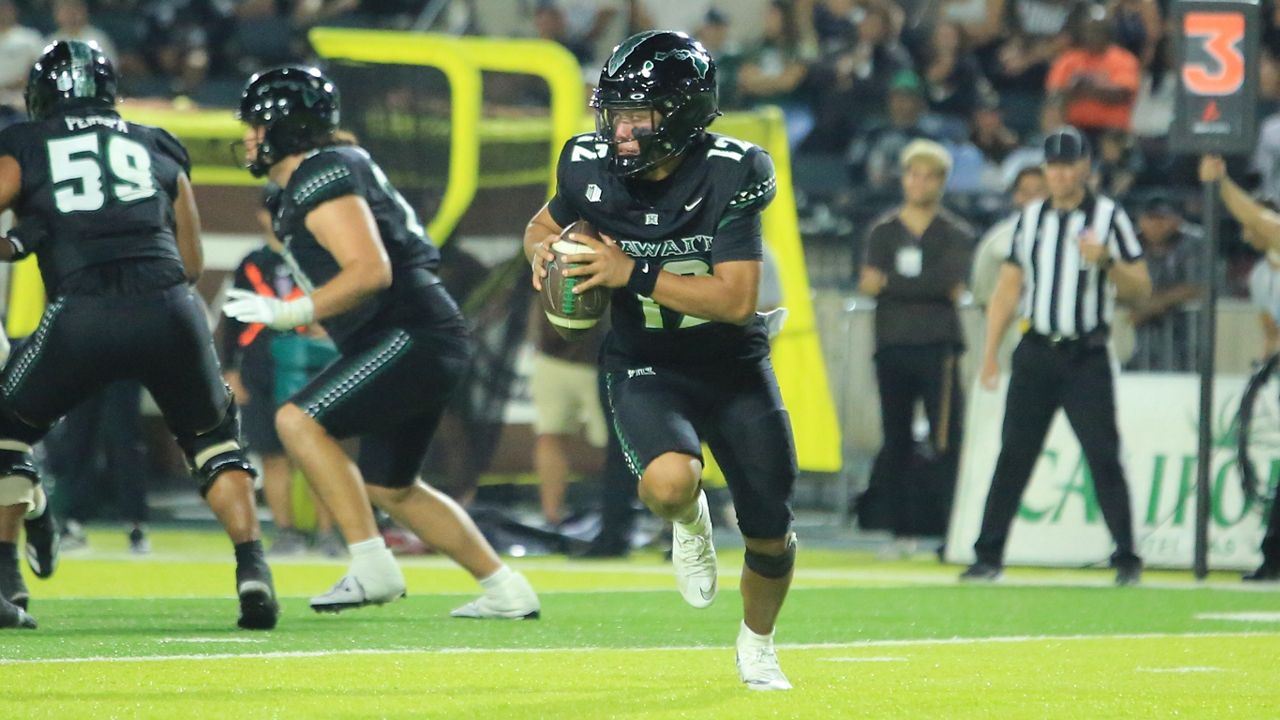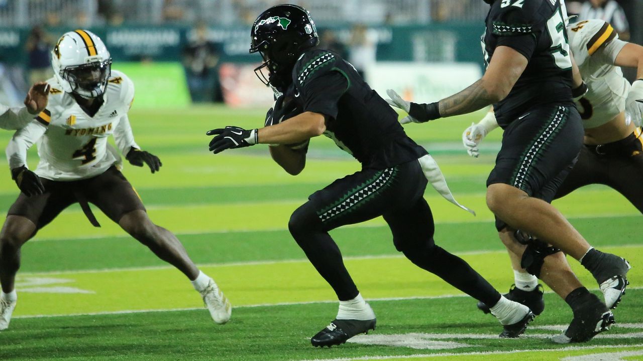 Hawaii receiver Pofele Ashlock (5) had a team-high 62 receptions for 704 yards and 6 touchdowns. (Spectrum News/Brian McInnis)