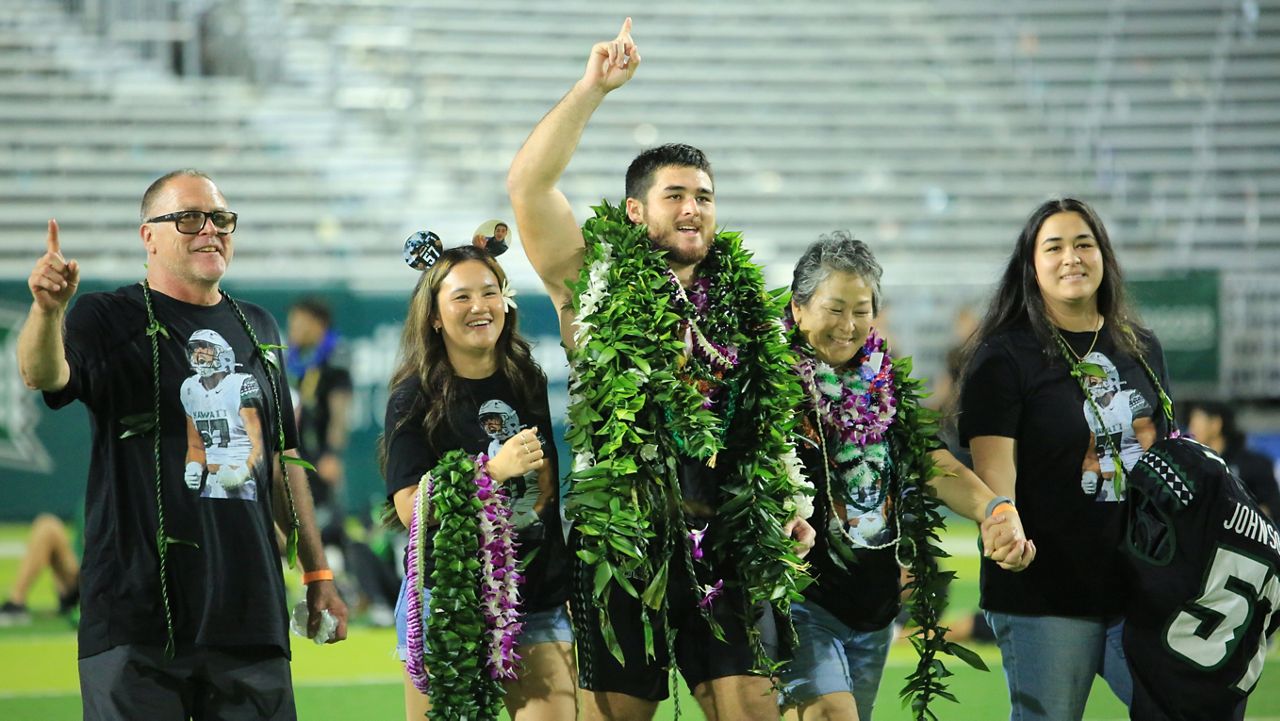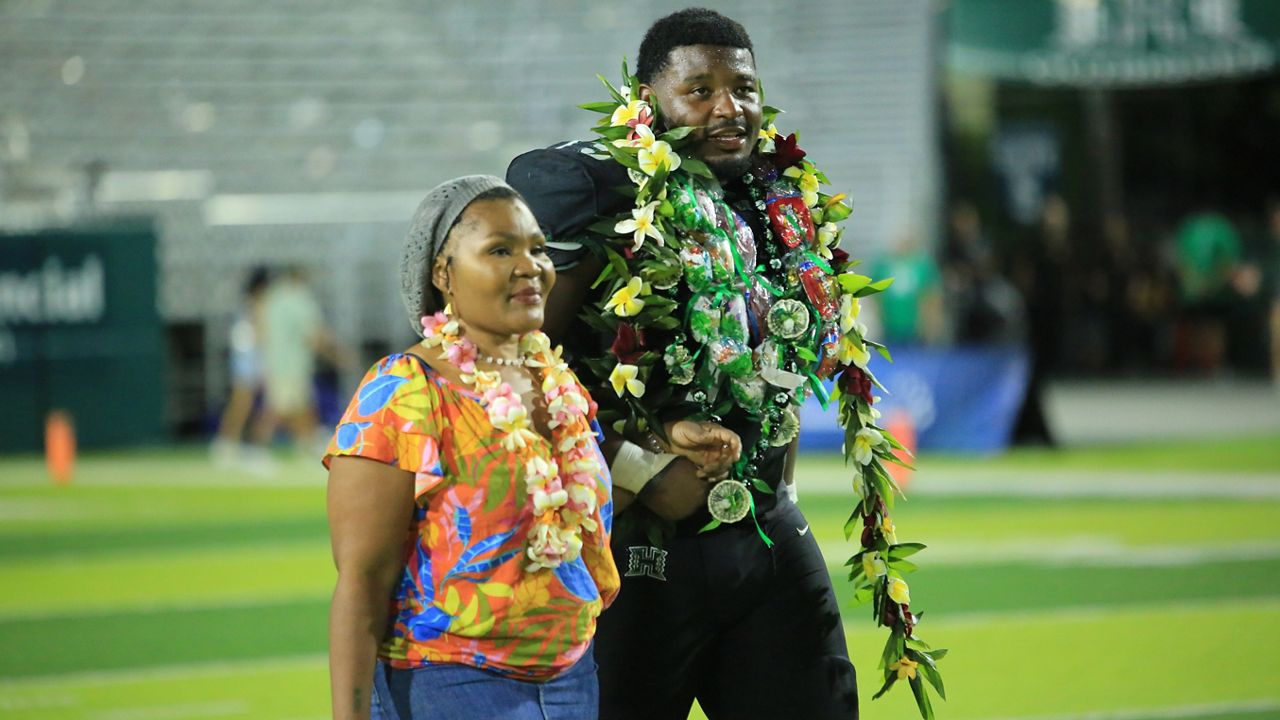 Defensive lineman Jackie Johnson III, a Roosevelt High alumnus from Honolulu, leads UH with 7.5 sacks. (Spectrum News/Brian McInnis)