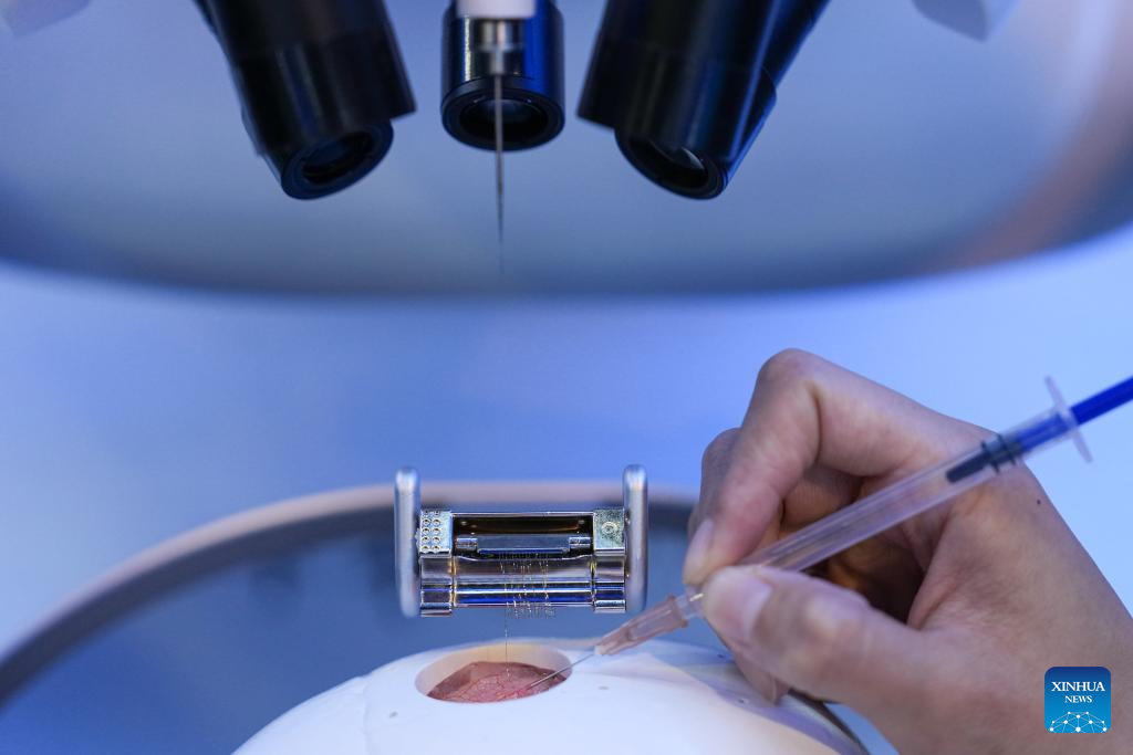 A employees member demonstrates an electrode wire implanted by a high-throughput versatile electrode implantation robotic at the permanent exhibition at the Zhongguancun Exhibition Center in Beijing, capital of China, March 25, 2026. The 2026 Zhongguancun Forum (ZGC Forum), working in Beijing by way of Sunday, is concentrated on the theme of “Full Integration Between Technological and Industrial Innovation.” Since its founding in 2007, this discussion board has turn into a significant worldwide occasion for advancing science and know-how innovation.