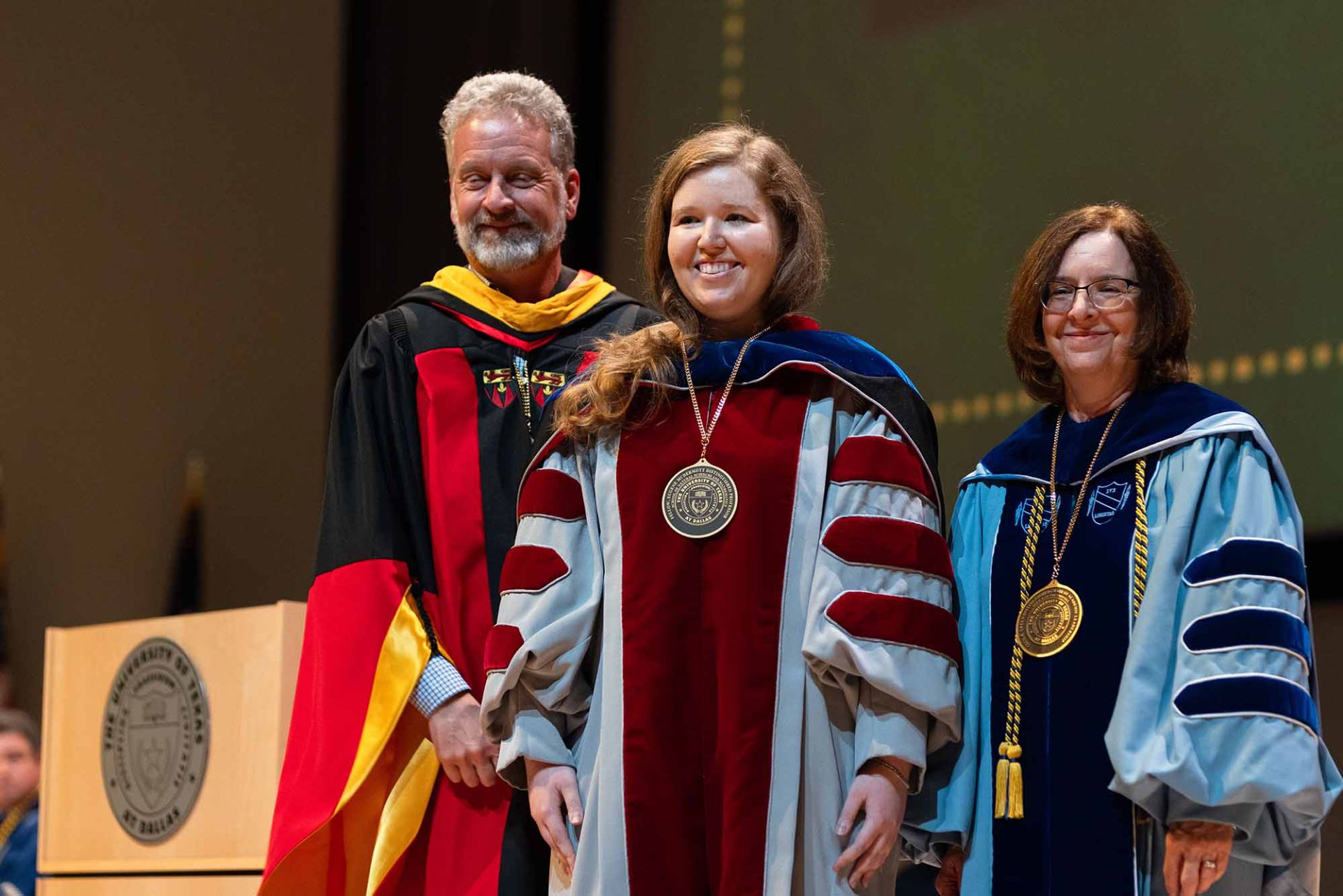 From left: Dr. David Hyndman, dean of the School of Natural Sciences and Mathematics and the Francis S. and Maurine G. Johnson Distinguished University Chair; Dr. Nicole De Nisco; and Dr. Inga H. Musselman, provost, vice chairman for tutorial affairs and the Cecil H. Green Distinguished Chair of Academic Leadership. De Nisco, affiliate professor of organic sciences, was honored as Fellow, Eugene McDermott Distinguished Professor throughout final yr’s investiture ceremony.