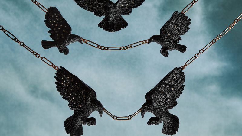 Called “Ravens,” the collection options black ravens in mid-flight, intricately carved from Whitby jet by British artisan Graham Heeley and set in gold by native jeweler Ian Fowler. Wightman is intent on completely utilizing UK supplies and craftsmanship in her assortment. Her debut additionally consists of items carved from Moorland boxwood and shed deer antlers she plucked from her yard.