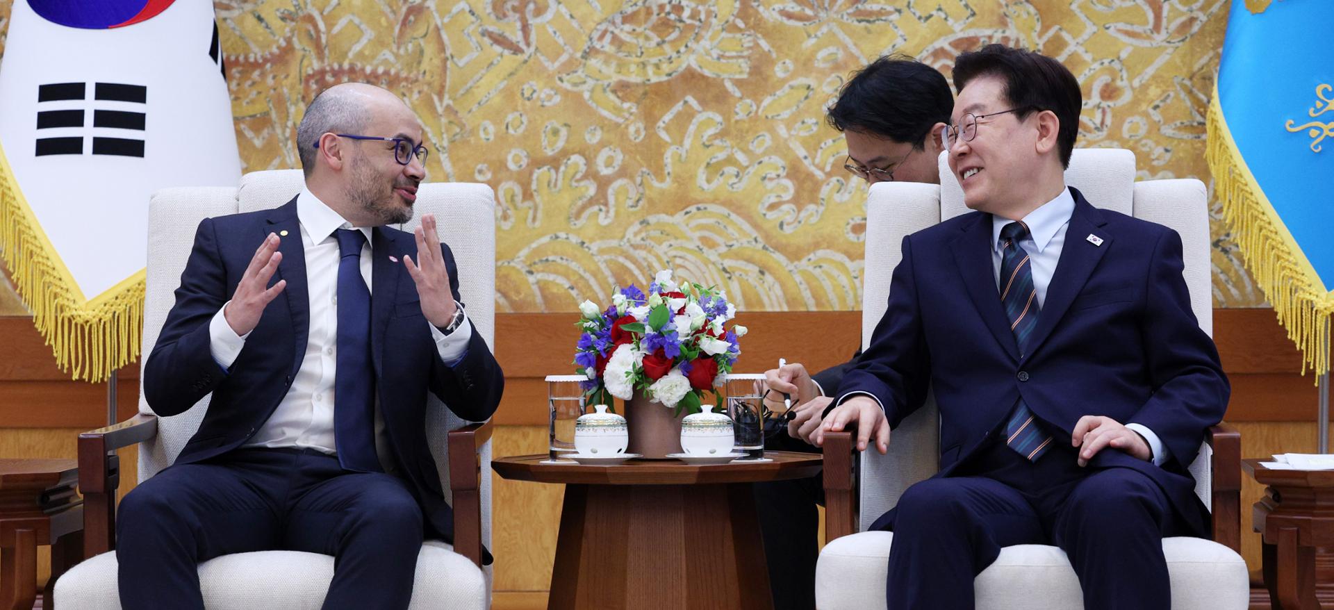 President Lee Jae Myung speaks with Google DeepMind co-founder and CEO Demis Hassabis at Cheong Wa Dae in Seoul, Monday. Yonhap