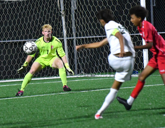 Williamsport purpose hold Maxwell Fink (1) waits for the kick from Lewisburg’s Viktor Permyashkin (20) within the first half.