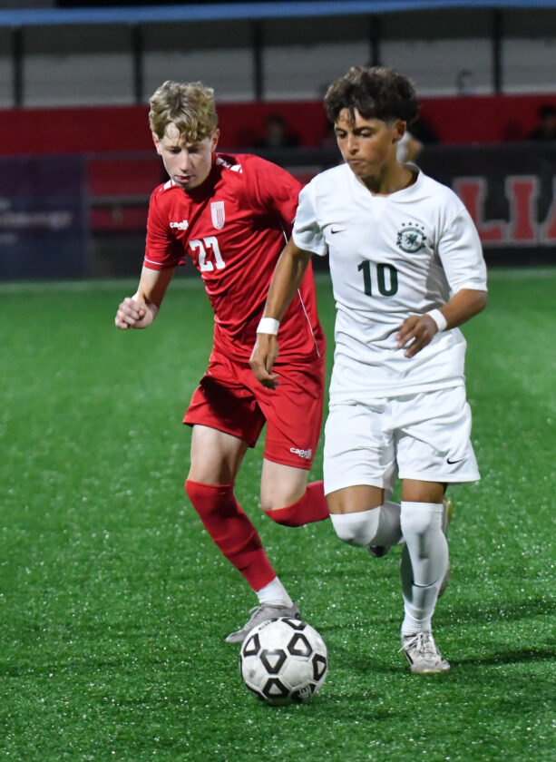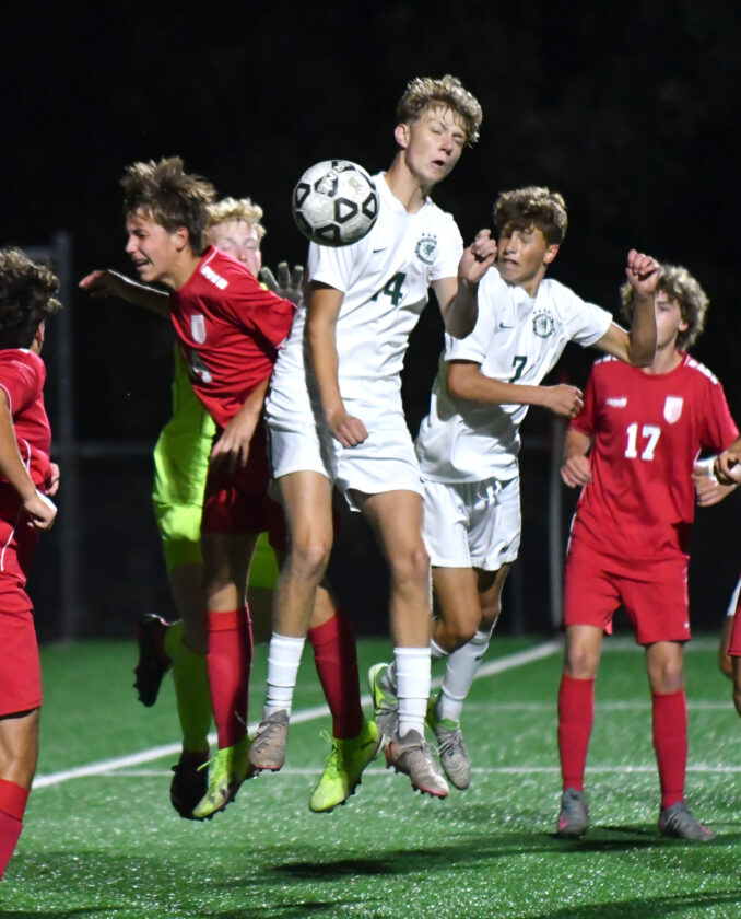 Williamsport’s Adoniram Hill (14) and Lewisburg’s Logan Kitchens (14) attempt to head the ball on a nook kick within the first half.