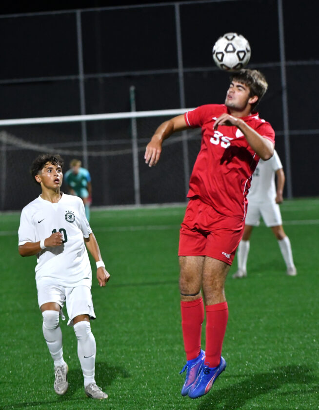 Williamsport’s Brock Lehr (5) and Lewisburg’s Jack Kohl (7) attempt to head the ball within the first half.