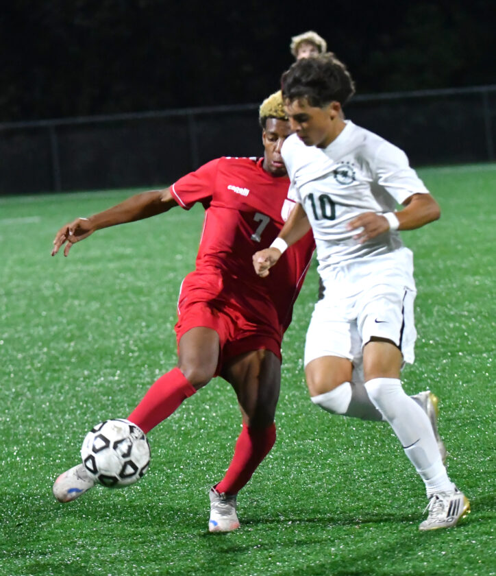 Williamsport’s Dumfer Adjei-Frimpong (7) and Lewisburg’s Eli Abunasser (10) battle for management of the ball within the first half.