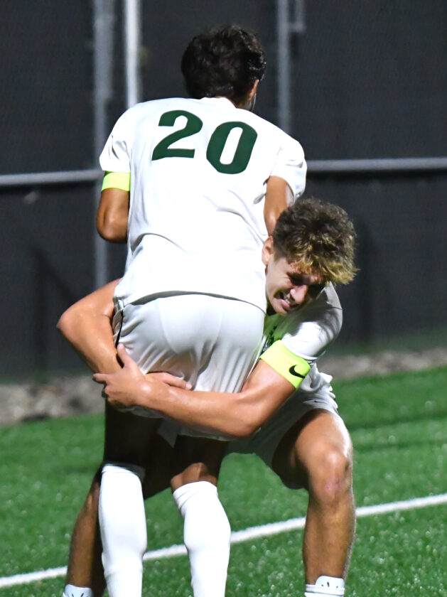 Lewisburg’s Isaac Ayers (9) celebrates with Viktor Permyashkin (20) after Ayers’ purpose on a penalty kick from Permyashkin with 24:59 left within the first half.