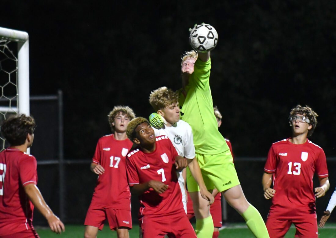 Williamsport purpose keeper Maxwell Fink bats down the ball over Lewisburg’s Logan Kitchens on a nook kick within the first half.