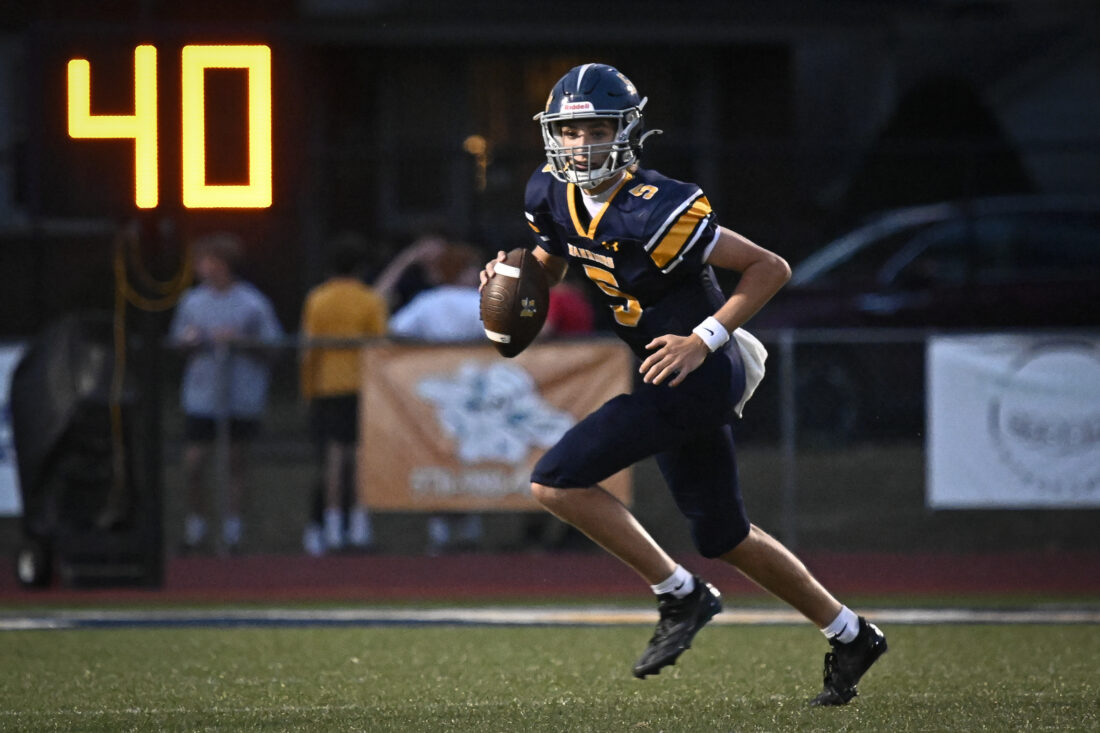 Montoursville quarterback Elijah Eck appears to be like for a receiver throughout a highschool football sport in opposition to Danville at Montoursville on Friday.