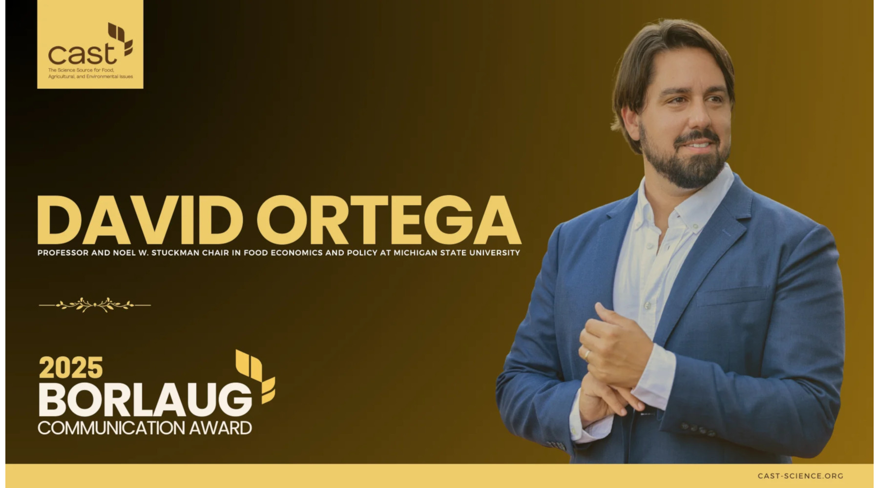 AMES, Iowa — The Council for Agricultural Science and Technology (CAST) is proud to announce David L. Ortega, Professor and Noel W. Stuckman Chair in Food Economics and Policy at Michigan State University, because the recipient of the 2025 Borlaug CAST Communication Award (BCCA).