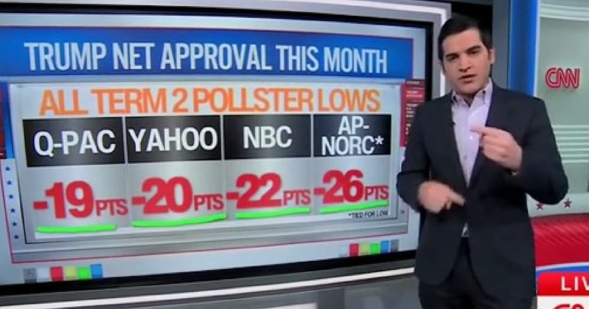 Citing a mean of current surveys from AP-NORC, NBC News, Yahoo-YouGov, and Quinnipiac, Enten famous that Trump’s internet approval ranking now stands at -22. By comparability, Joe Biden was at -13 in February 2022, whereas Trump sat at -12 throughout the identical level in his first time period.