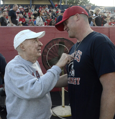 Staff picture / R. Michael Semple. Former Niles coach Bill Bohren (left) makes a degree with 2000 Red Dragons participant Brian Middlestone on Friday night time at Bo Rein Stadium.