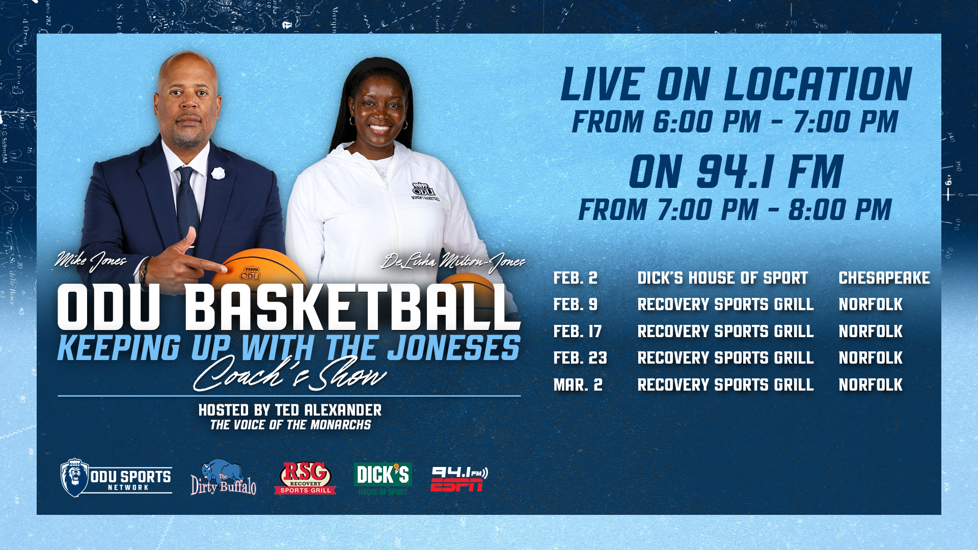 ODU Director of Broadcasting Ted Alexander, the Voice of the Monarchs, will host the show as both Head Coaches, Mike Jones and DeLisha Milton-Jones, discuss their respective seasons and provide an inside look at Monarch Basketball. The first two segments of the show will cover ODU Men’s Basketball, the next two segments will cover ODU Women’s Basketball, and the final segment will be a wrap up.