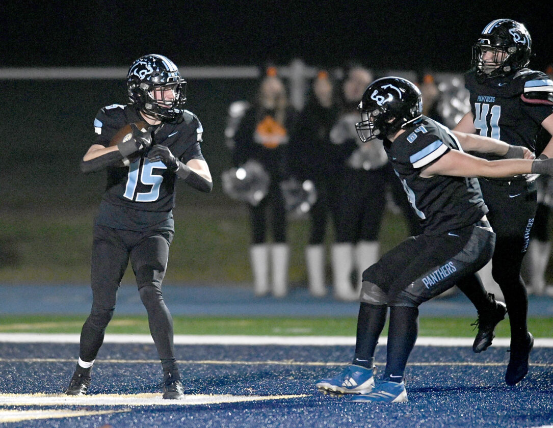 Penn Cambria’s Evan Latterner (15) celebrates his TD run after recovering a fumble on Colin Gongloff’s interception (proper).
