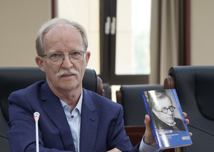 Professor Franz Gadermann presents the biography of German Sinologist Richard Wilhelm at a discussion board in Qingdao University of Science and Technology, in Qingdao City, Shandong Province, on September 5 (YIN KANG)