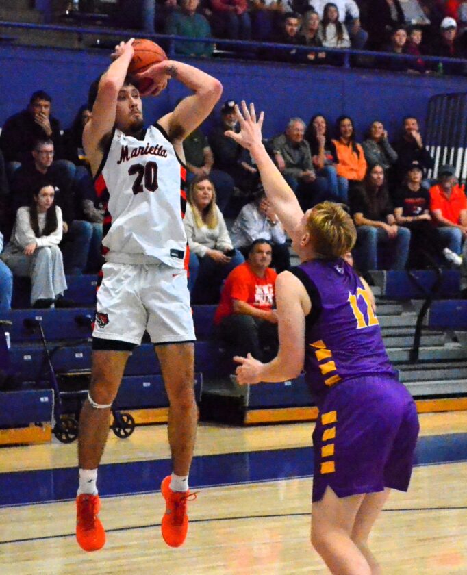 Marietta’s Zaiden Wittekind makes an attempt a jumper in opposition to Bloom-Carroll through the River City Classic Sunday at Ban Johnson Arena. (Photo by Mike Morrison)