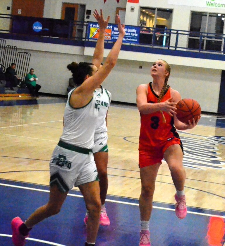 Marietta’s Hayleigh Chidester (3) assaults the basket in opposition to Fairland through the River City Classic Sunday at Ban Johnson Arena. (Photo by Mike Morrison)