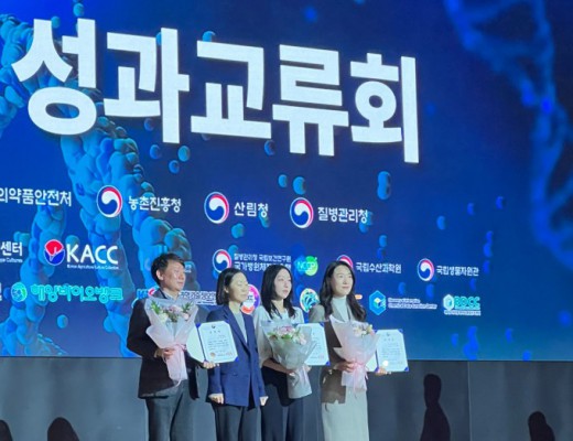 Professor Ahra Ko (third from left) of POSTECH’s Department of Life Sciences receives a ministerial quotation from the Ministry of Science and ICT for her contribution to the administration and utilization of nationwide bio-research sources on the ‘4th Pan-Ministerial Bio-Research Resources Achievement Exchange.’ Photo courtesy of POSTECH.