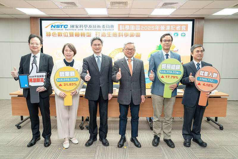 The nation’s three main science parks final yr posted a combined revenue of NT$5.8 trillion (US$182.6 billion), up 21.83 % year-on-year and a brand new record, the National Science and Technology Council mentioned in a report yesterday.