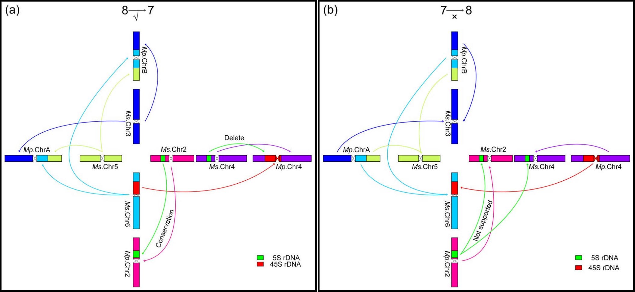 The researchers also analyzed ribosomal DNA patterns. In species with x = 8, 5S rDNA appears on chromosomes 2 and 4, while 45S rDNA is located on chromosome 6. In M. polymorpha with x = 7, 5S rDNA remains only on chromosome 2, and 45S rDNA shifts to chromosome 4.