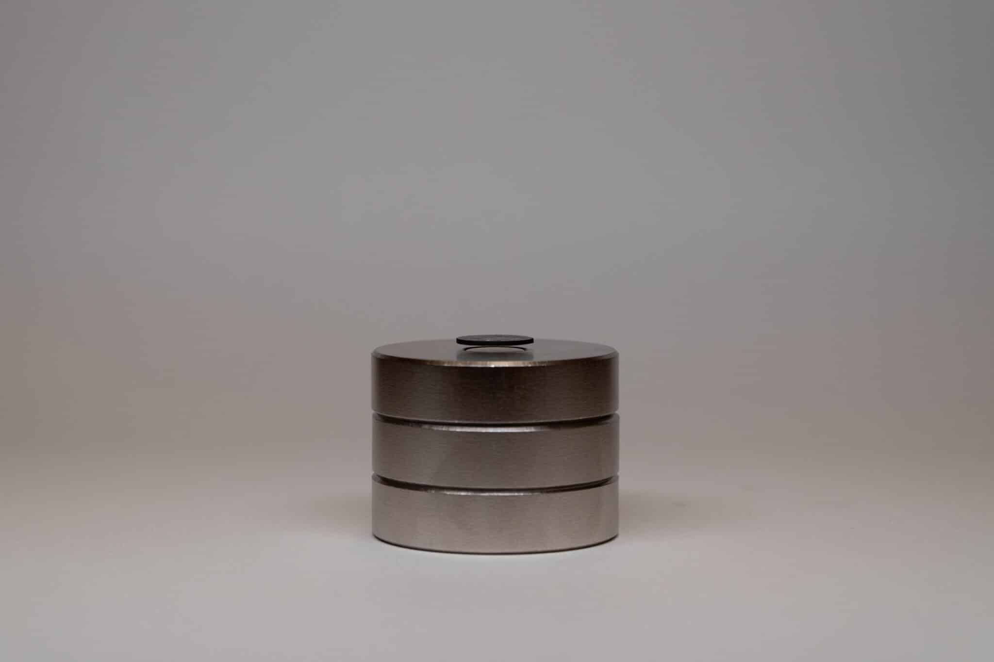 {A photograph} of a black graphite disk floating above a stack of three, spherical magnets. (Credit: Adrian Skov (OIST))