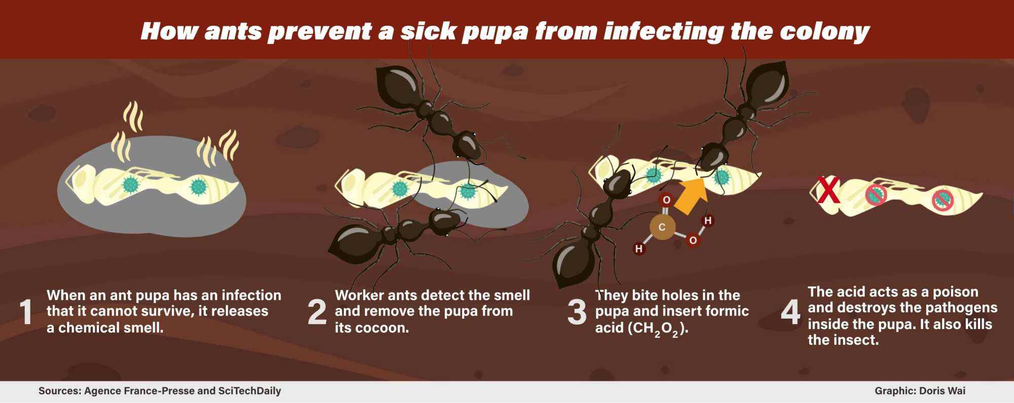 Scientists had already found out that when these pupae are terminally in poor health, there is a chemical change that produces a selected scent. The scent indicators employee ants to destroy each the colony-threatening pathogen and the pupae (see graphic).