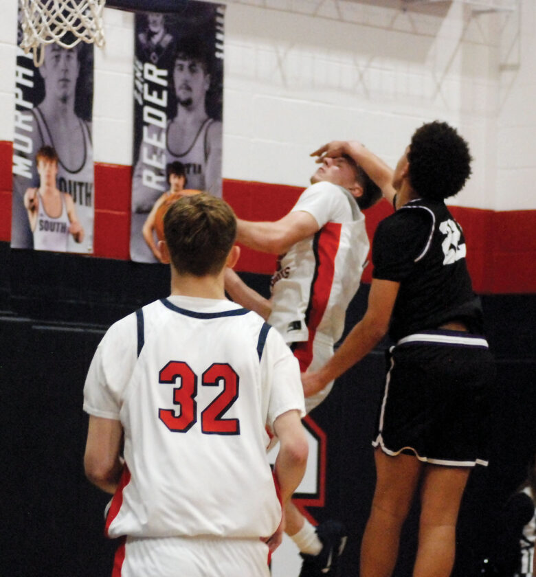 Parkersburg South’s Harry Silvis, who scored a game-high 30 factors throughout the Patriots’ 83-64 Mountain State Athletic Conference victory versus Riverside Saturday afternoon inside Rod Oldham Athletic Center, will get hit on the way in which to the outlet by Rocco Terry. (Photo by Jay W. Bennett)