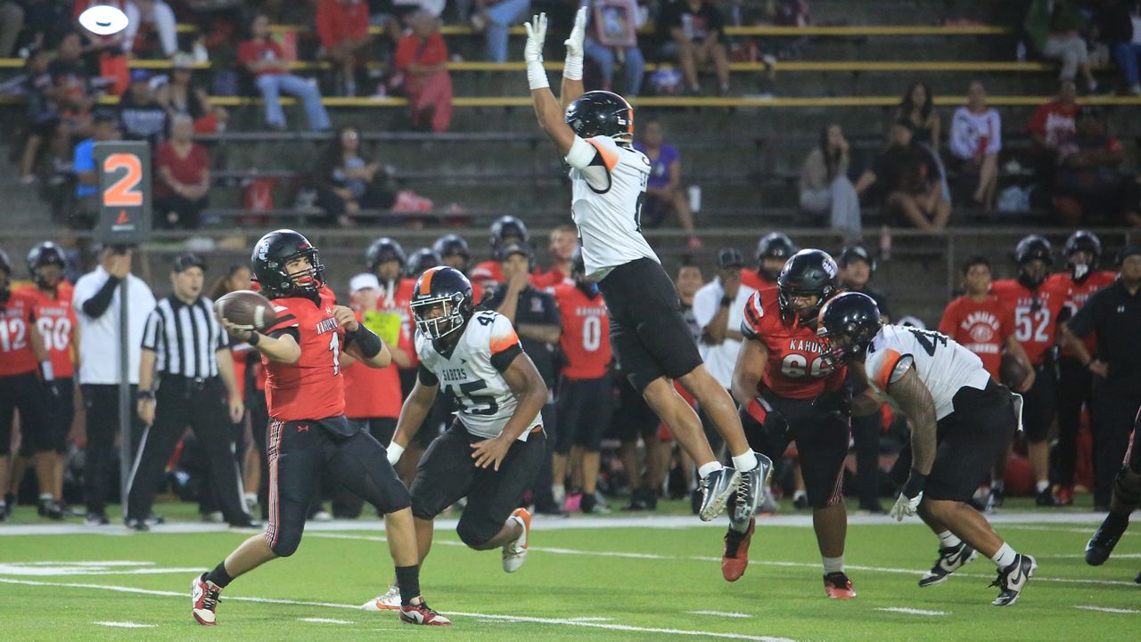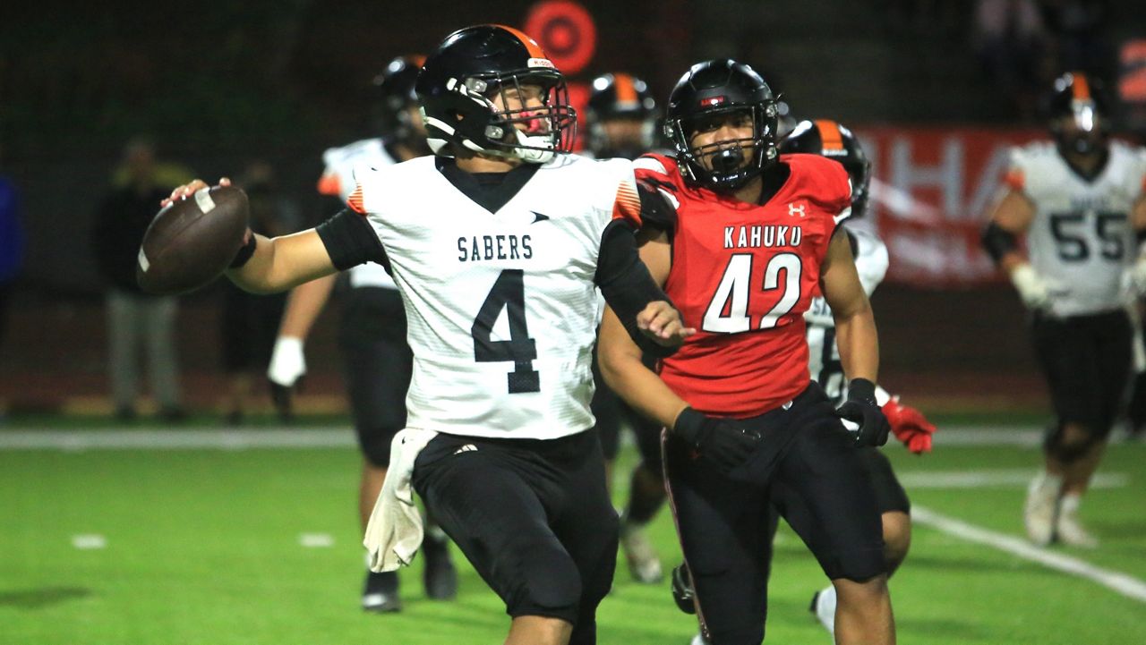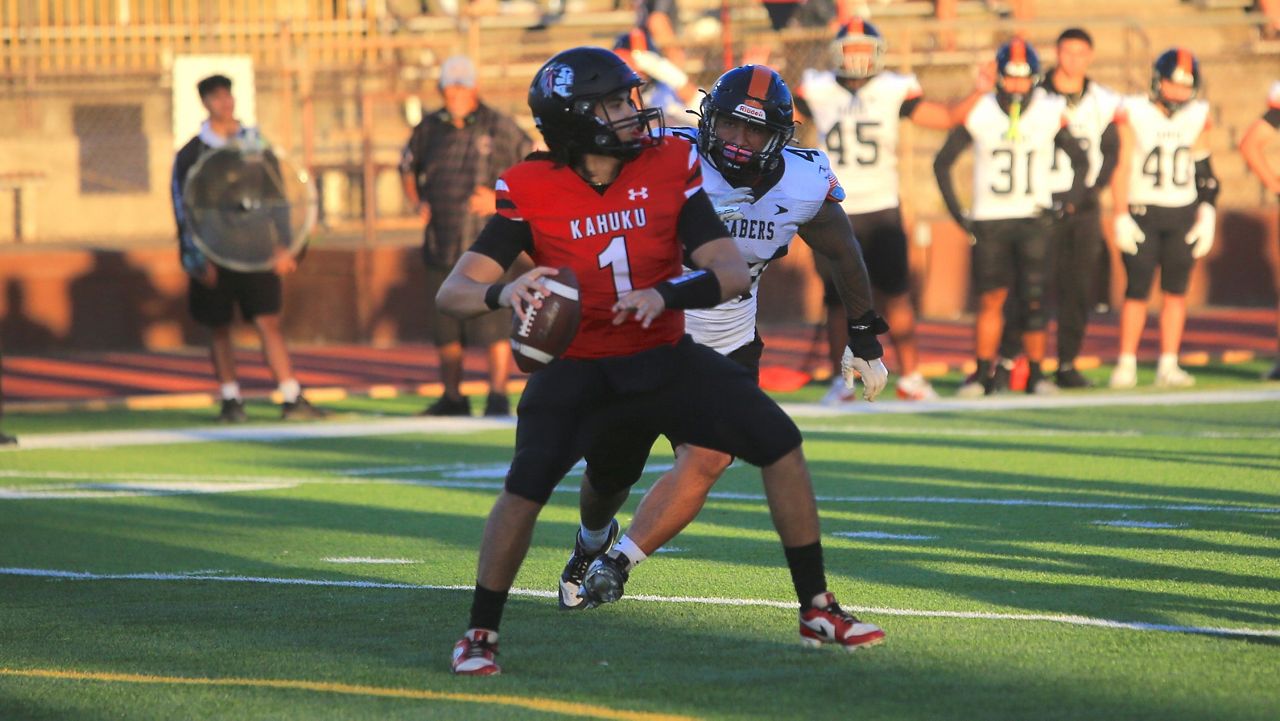 Campbell quarterback Brayden Medeiros threw on the run beneath pursuit by Kahuku’s Fouvale Ueni. (Spectrum News/Brian McInnis)