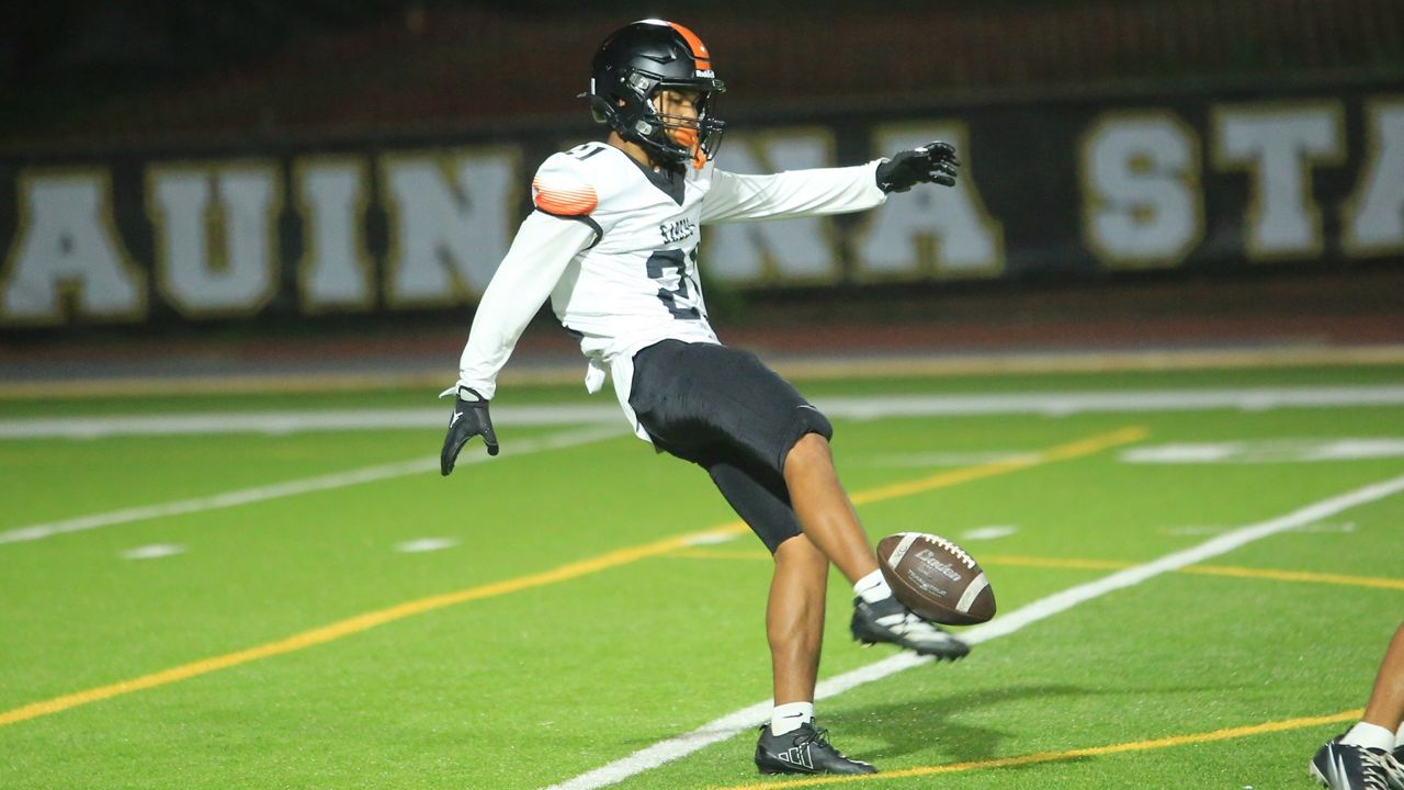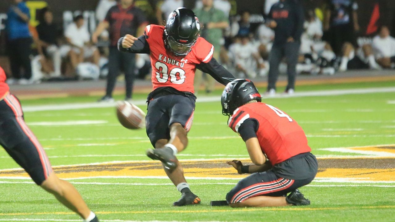 Kahuku kicker Jadyn Parker drilled a 52-yard discipline purpose within the fourth quarter. (Spectrum News/Brian McInnis)