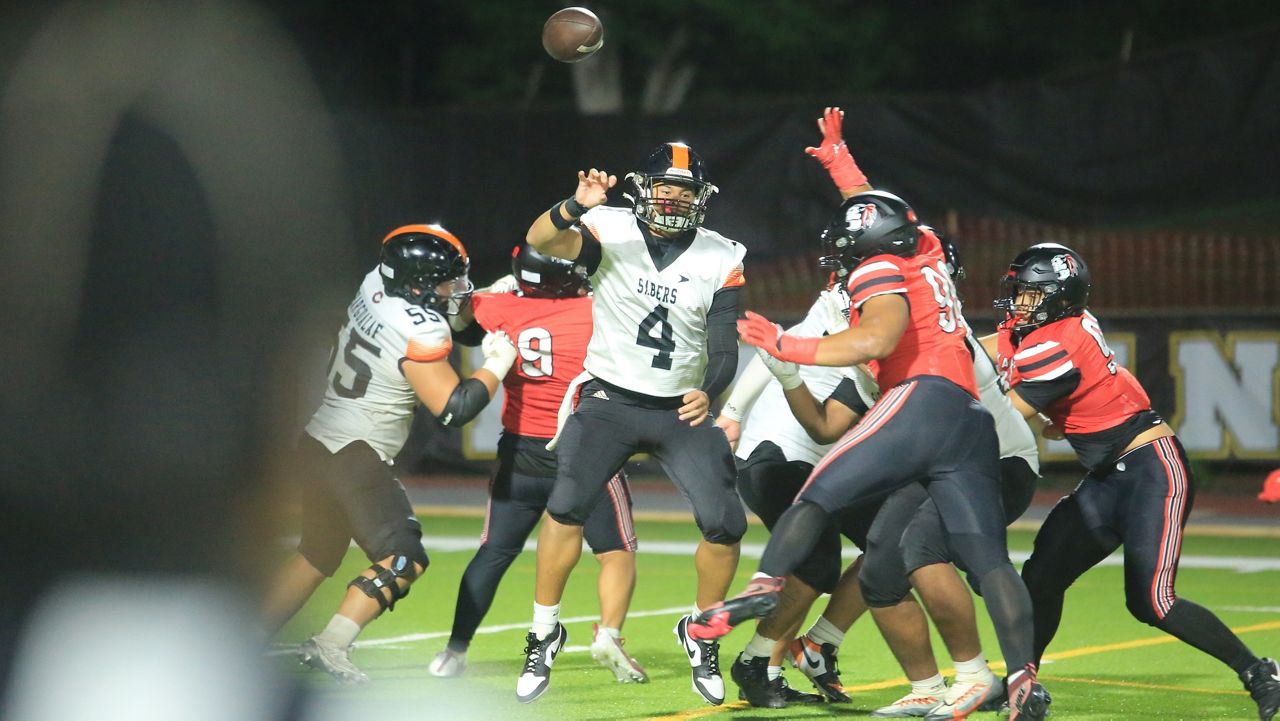 Campbell quarterback Brayden Medeiros handed in midair whereas beneath stress. (Spectrum News/Brian McInnis)