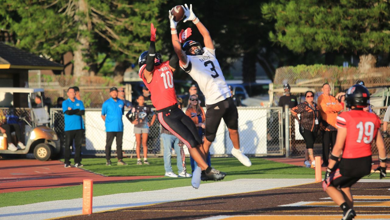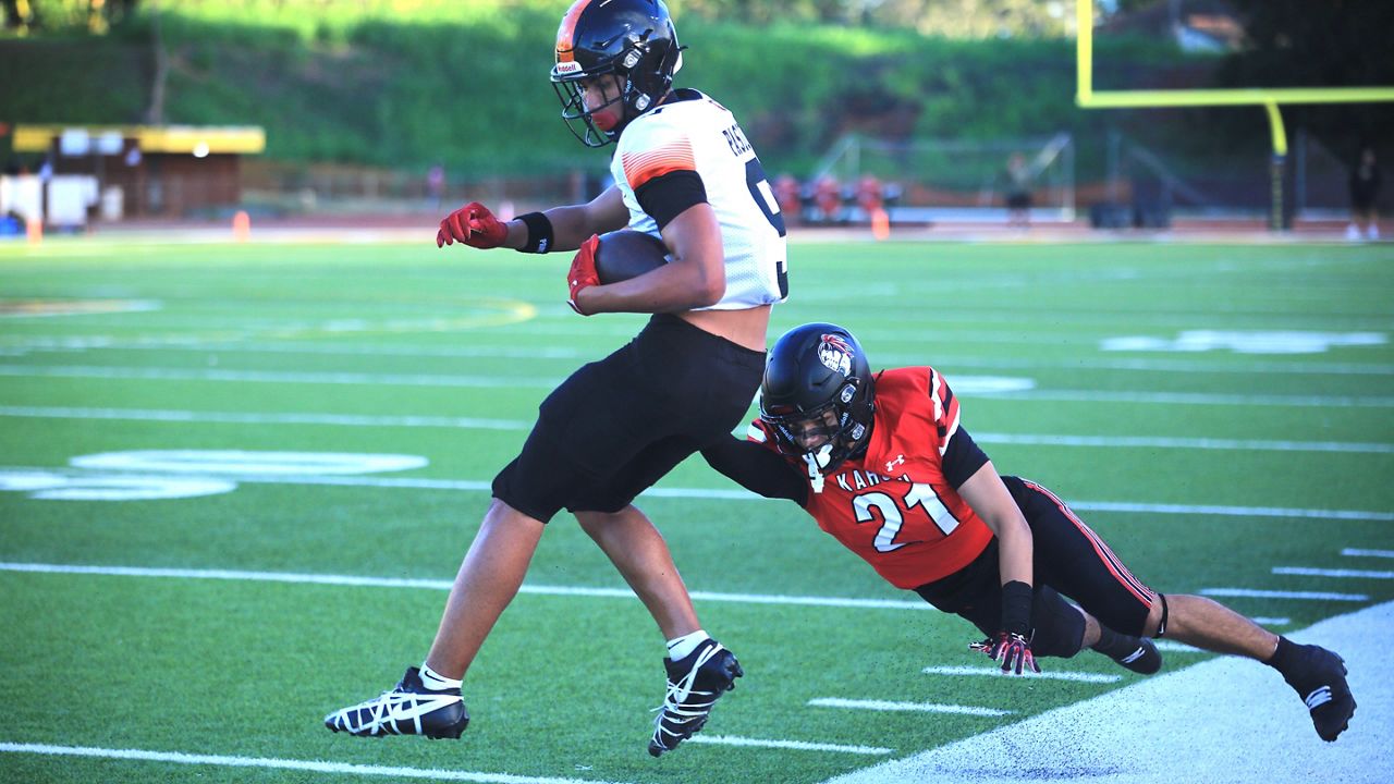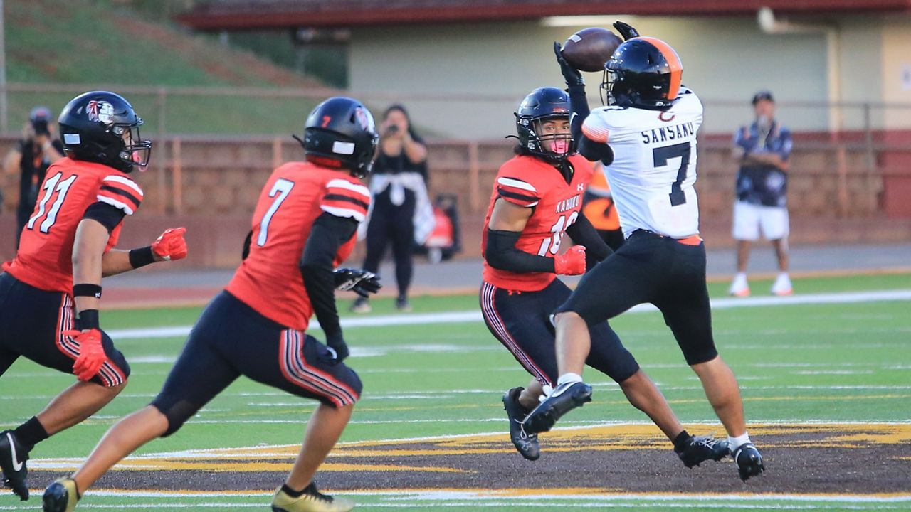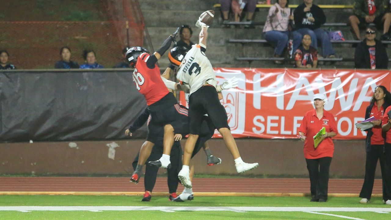 Shaison Kupukaa hauled in a 20-yard landing catch at the back of the tip zone in opposition to Kahuku’s Madden Soliai within the first quarter. (Spectrum News/Brian McInnis)