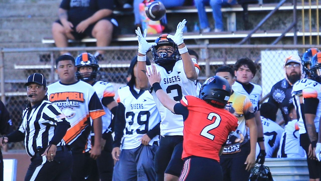 Campbell’s Shaison Kupukaa hauled in a move by the Sabers sideline in opposition to Kahuku’s Teave Crawford. (Spectrum News/Brian McInnis)