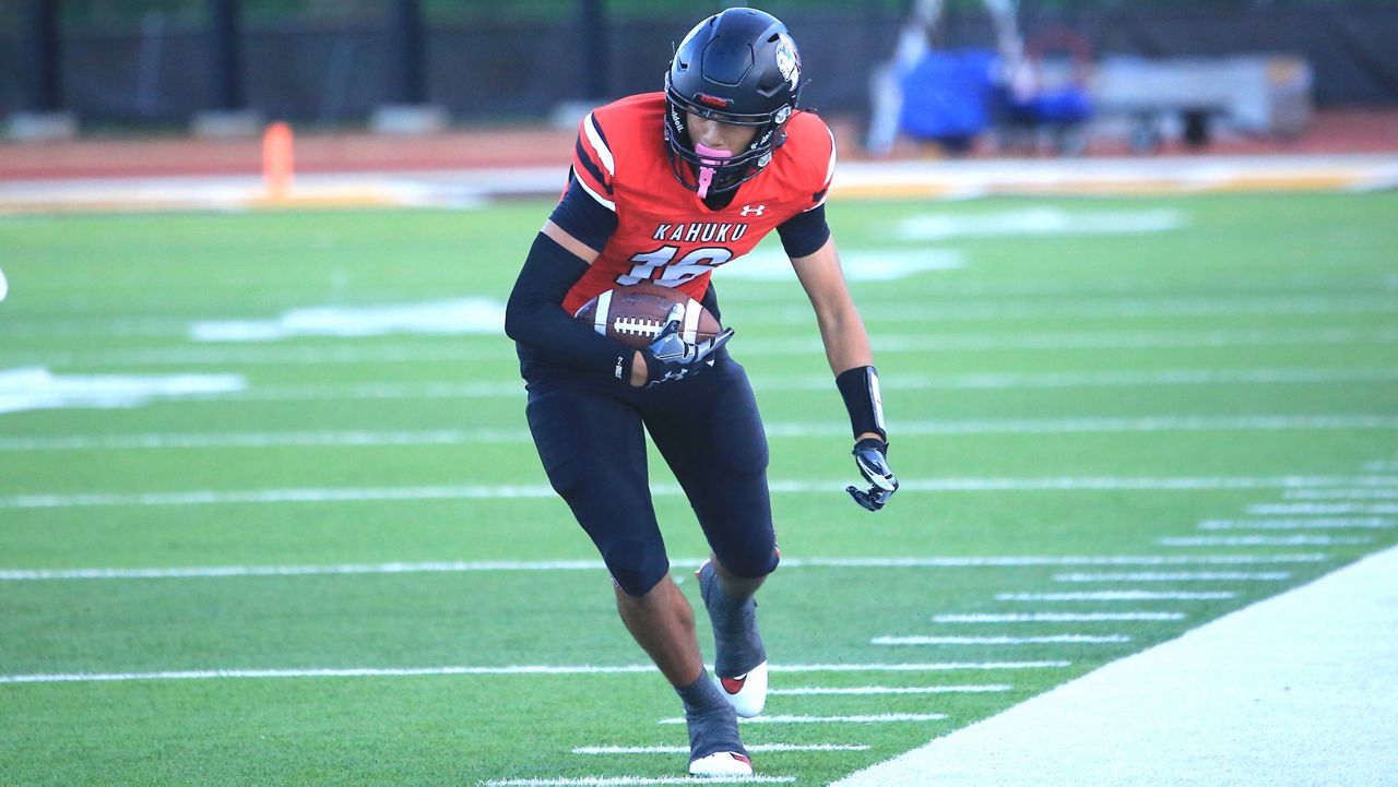Kahuku’s Christian Sanford-Tupuola was in a discipline by himself on his 79-yard landing catch from Troy Maritegari. (Spectrum News/Brian McInnis)