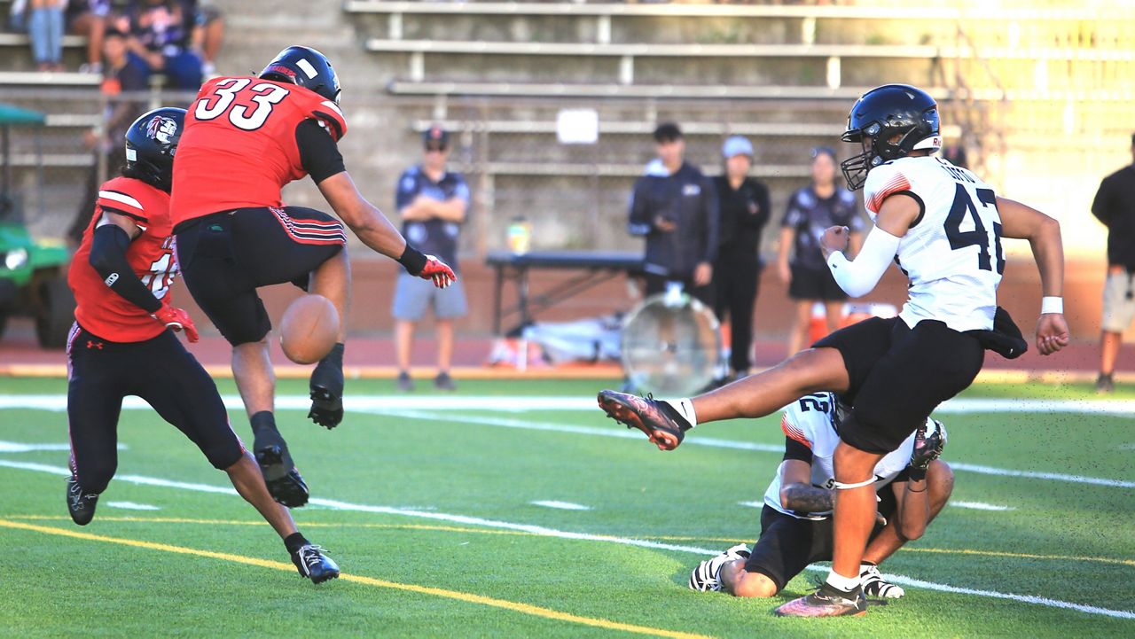 Kahuku’s Noah Ah You (33) blocked a point-after tried by Campbell’s Mitch Lifto. (Spectrum News/Brian McInnis)